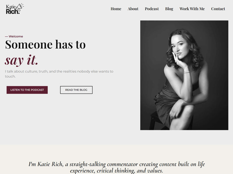 I designed and developed the official website for Katie Rich, a straight talking commentator and podcast host who speaks on culture, truth, healing and values. The goal was to create a clean, editorial style site that immediately communicates her core message “Someone has to say it” and guides visitors into her two main content pillars: the podcast and the blog. katierich.com.au